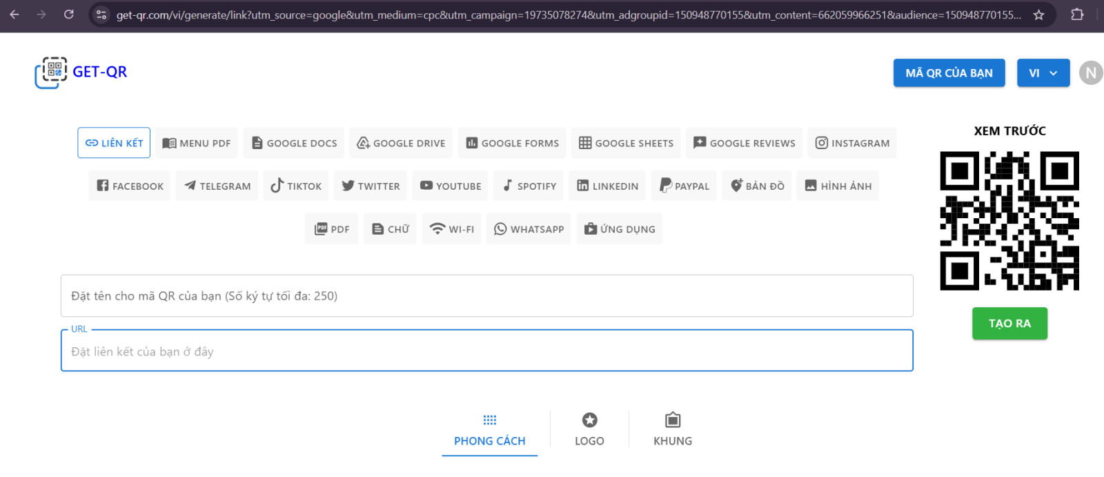 Người dùng có thể truy cập vào link https://get-qr.com/ để tạo mã QR bằng cộng cụ GET - QR: