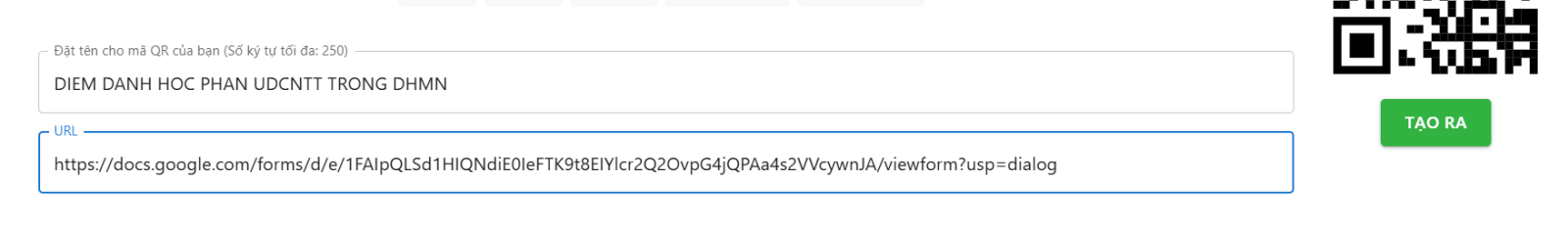 Đặt tên cho mã QR/ Dán đường link phiếu điểm danh đã sao chép ở trên vào khung URL/ chọn Tạo ra.
