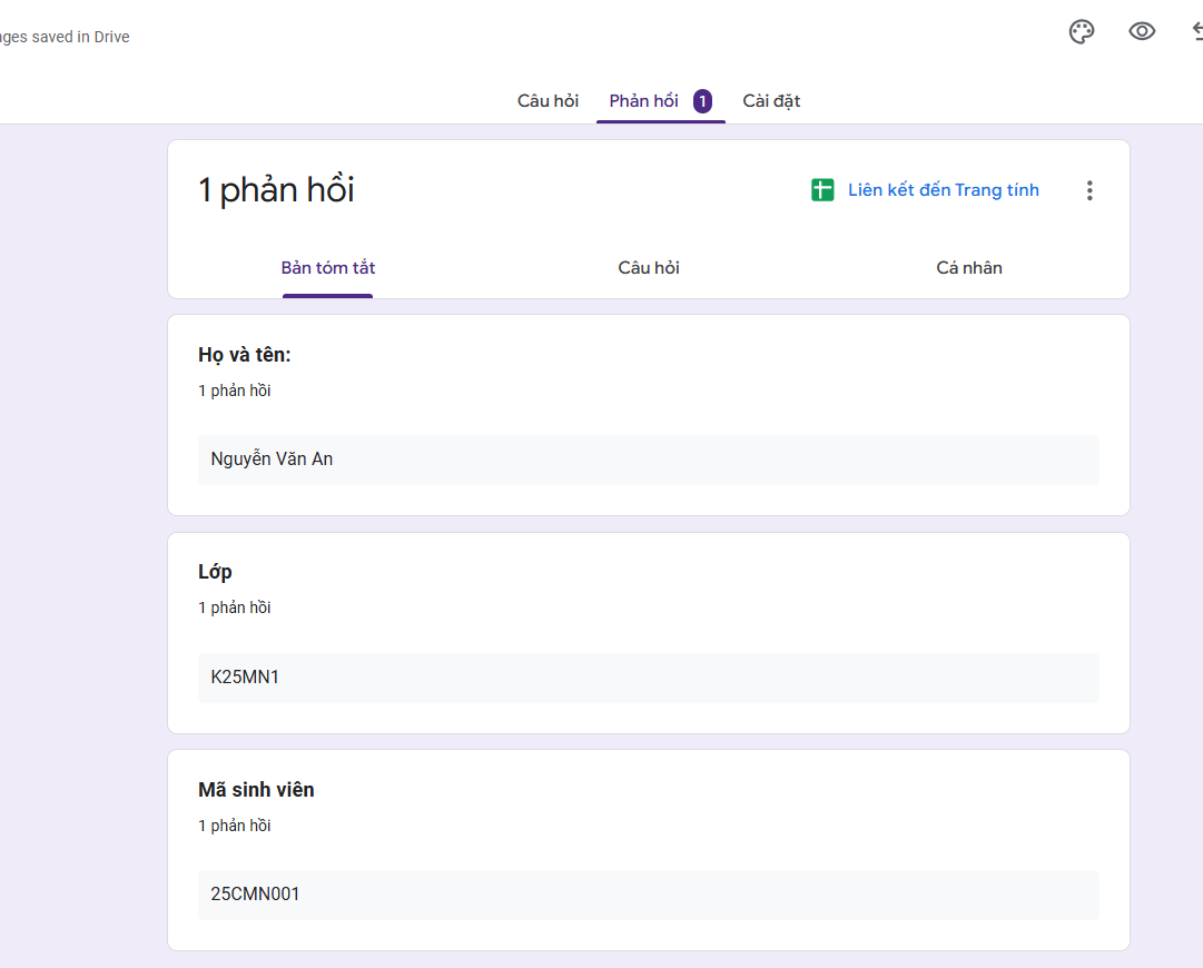 Kết quả điểm danh được xuất ra file excel/ chọn Liên kết đến trang tính