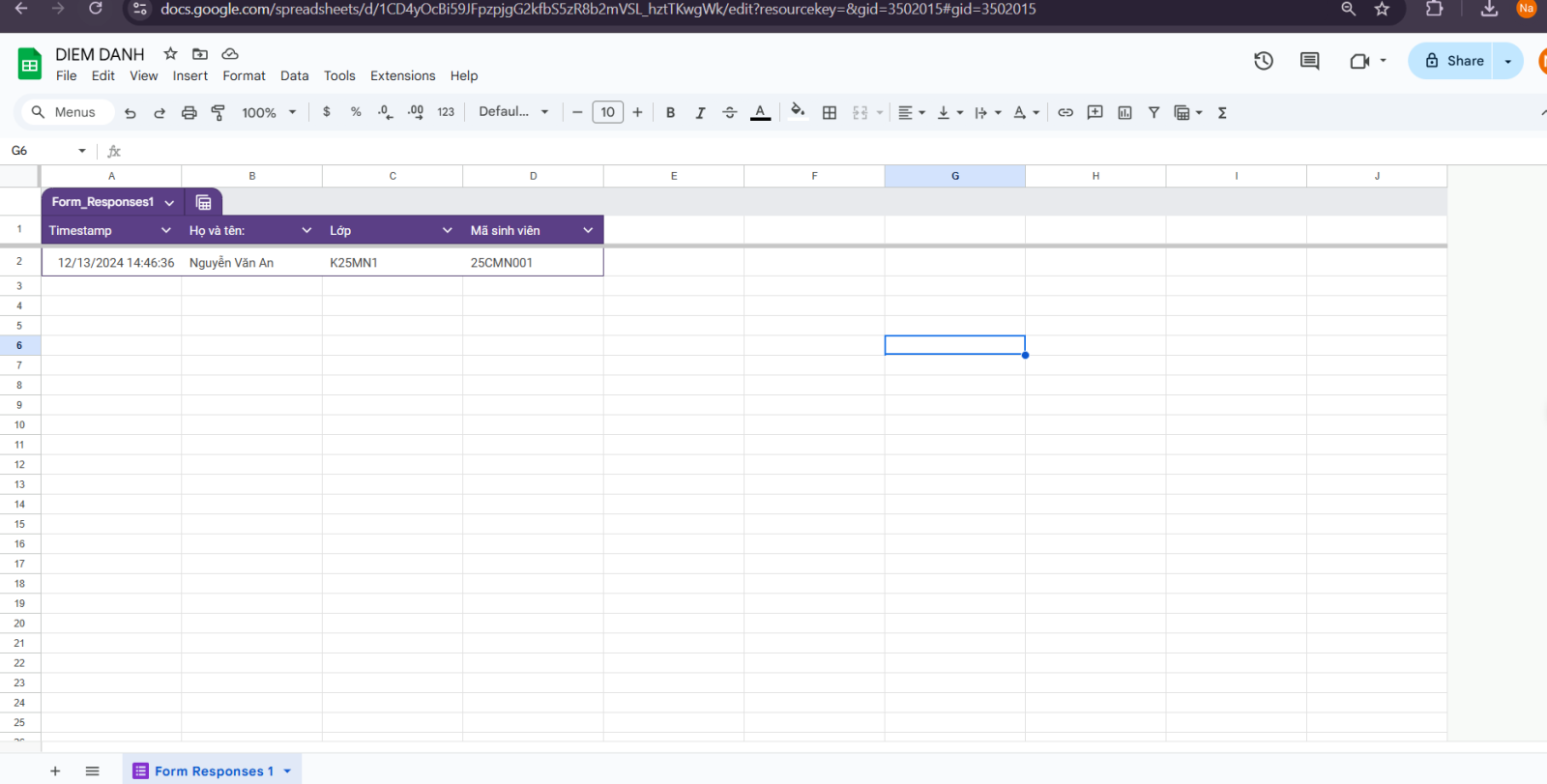 Mã QR của google form dành cho hệ thống theo dõi sinh viên về việc lên lớp đúng giờ, tham gia chương trình, sự kiện của lớp, câu lạc bộ, đội nhóm và các chương trình nhà trường tổ chức. Hệ thống theo dõi này thuận tiện, chính xác và dễ sử dụng. Kết quả theo dõi được xuất ra dưới dạng file excel, thể hiện rõ thời gian bắt đầu tham gia. Trên file excel dữ liệu dễ dàng cho việc tìm kiếm, phân tích và tổng hợp. Mã QR của biểu mẫu google form đáng tin cậy cho hình thức điểm danh kỹ thuật số ngày nay. Bài viết xin giới thiệu quy trình thực hiện như sau: