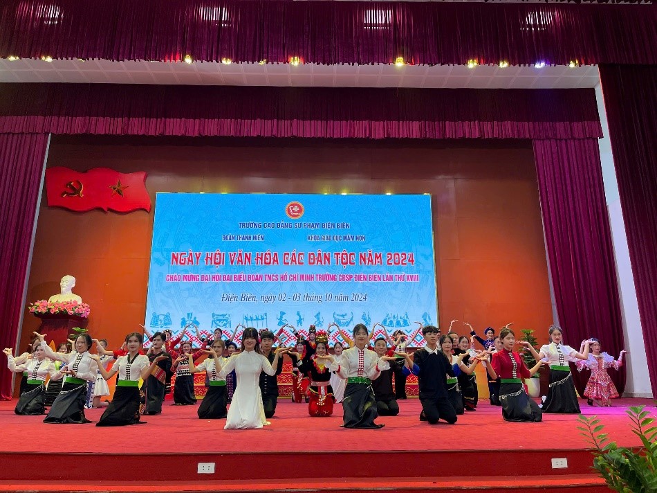 Chiều ngày 03/10/2024 sinh viên thuộc 13 đội của chi đoàn K25, K26 khoa GDMN tiếp tục thể hiện tài năng qua phần thi văn hóa văn nghệ đặc trưng của các dân tộc. Đến hội thi các đội đã trình diễn các tiết mục ca, múa, nhạc cụ dân tộc rất đặc sắc, mang đậm nét văn hóa của các dân tộc tỉnh Điện Biên như múa xèo Thái, múa Hà Nhì, Kèn H’Mông, tục tẳng cẩu, bắt vợ…