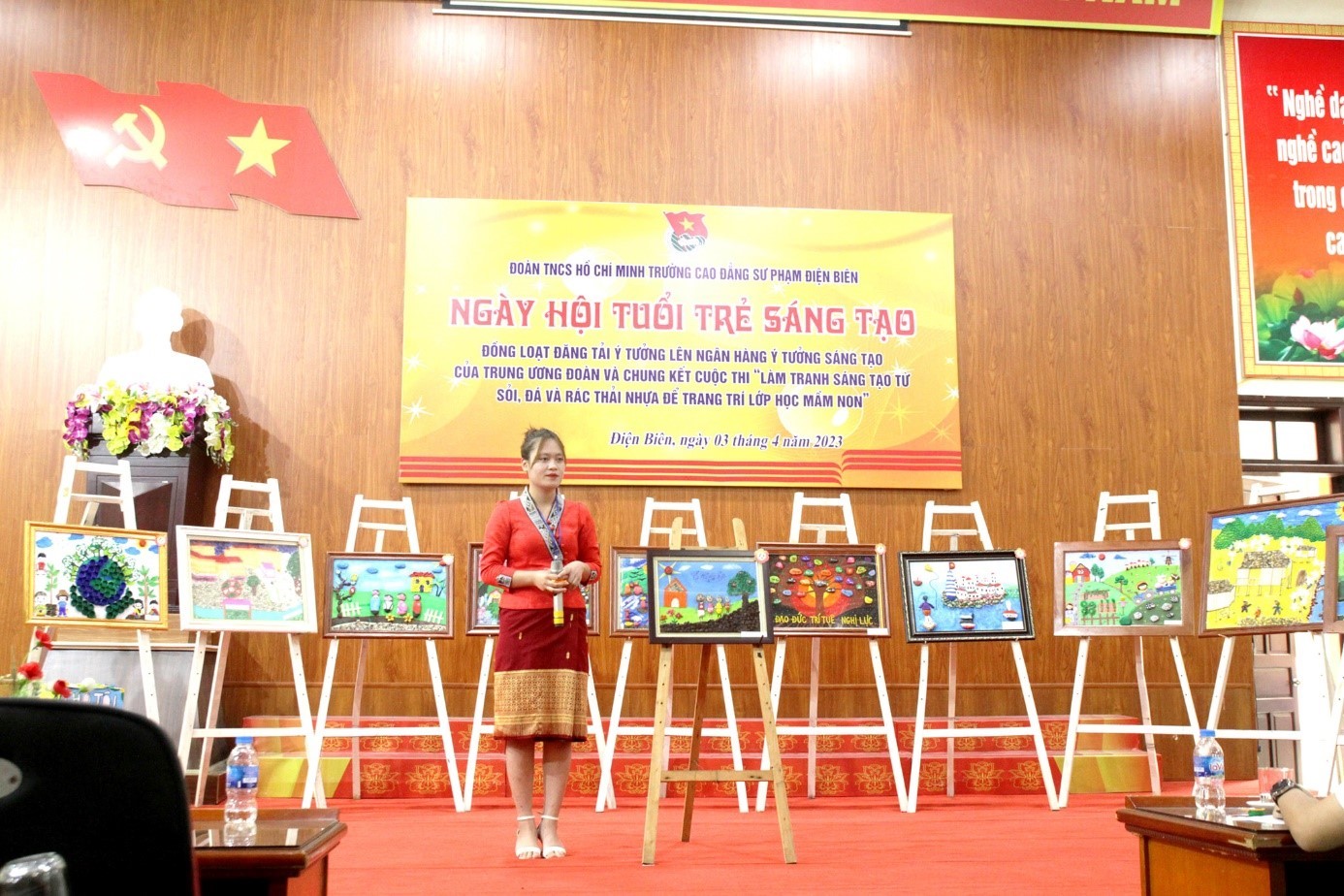 Hai là, tổ chức thi “Làm tranh sáng tạo từ sỏi, đá và rác thải nhựa để trang trí lớp học mầm non”. Hiện tại, 100% Đoàn viên sinh viên trường Cao đẳng Sư phạm Điện Biên là sinh viên ngành Giáo dục mầm non. Trong quá trình học các em đều được trang bị kiến thức về tổ chức hoạt động tạo hình, mỹ thuật, nghệ thuật tạo hình và thiết kế đồ dùng dạy học…Trên cơ sở phân tích điều kiện thực tiễn, Đoàn trường đã tổ chức cuộc thi “Làm tranh sáng tạo từ sỏi, đá và rác thải nhựa để trang trí lớp học mầm non” cho đoàn viên sinh viên. Cuộc thi chia làm 2 vòng đó là vòng Sơ khảo và vòng Chung kết. Sản phẩm dự thi phải đảm bảo về kích thước bức tranh (40cm x 60cm); chất liệu làm tranh phải được chế tạo từ sỏi, đá và rác thải nhựa; chủ đề tuỳ vào sự lựa chọn và sáng tạo của chi đoàn và các cá nhân dự thi; mỗi sản phẩm dự thi phải đóng khung trước khi nộp, có tên của chi đoàn hoặc tên tác giả đối với sản phẩm cá nhân dán ở góc phải phía dưới của sản phẩm, 01 bài thuyết minh về sản phẩm, 01 video không quá 02 phút về quá trình thu gom chất liệu, làm tranh và hình ảnh sản phẩm hoàn chỉnh thực hiện trên ứng dụng TikTok hoặc CapCut, nhạc nền trong video phù hợp với bức tranh và lứa tuổi mầm non. Tổ chức thi vòng Sơ khảo (sản phẩm dự thi được tính theo phương thức 40% điểm bình chọn trực tiếp trên trang fanpage “Đoàn TNCS Hồ Chí Minh Trường CĐSP Điện Biên” và 60% điểm từ Ban Giám khảo. 12 tác phẩm xuất sắc nhất sẽ được lựa chọn để dự thi Vòng Chung kết); vòng Chung kết, hình thức thi là thuyết minh về bức tranh trong thời gian 05 phút. Đây là một hoạt động ý nghĩa vừa giúp các em nâng cao kĩ năng, nghiệp vụ vừa tuyên truyền tới cộng đồng chung tay hưởng ứng phong trào Chống rác thải nhựa theo sự chỉ đạo của Tỉnh đoàn.
