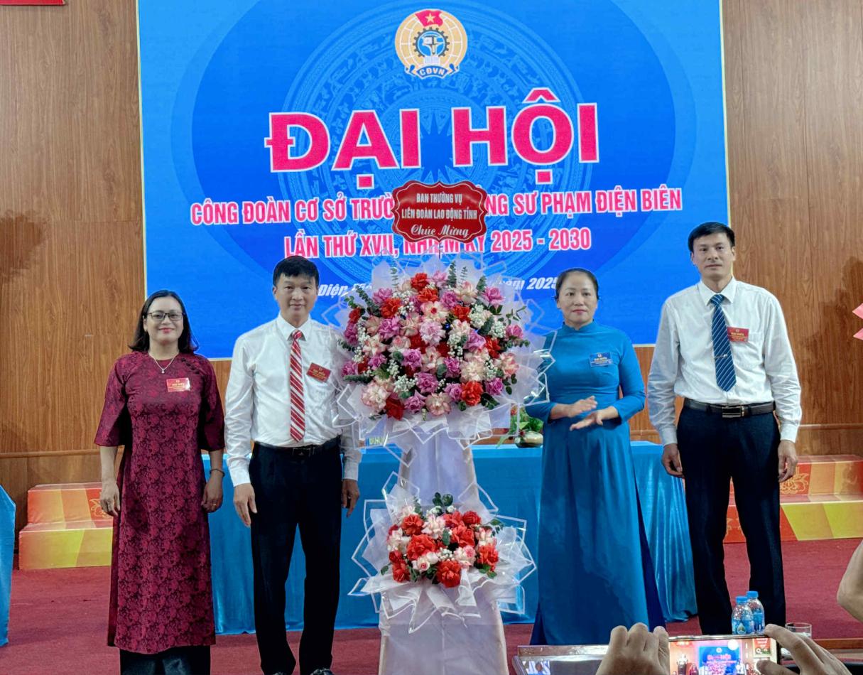 Lãnh đạo tặng hoa chúc mừng Ban Chấp hành Công đoàn trường lần thứ XVII, nhiệm kỳ 2025-2030 (đồng chí Mai Đình Nam, thứ 3 từ phải qua được bầu giữ chức Chủ tịch Công đoàn trường khóa mới)