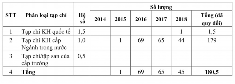 Số lượng bài của các cán bộ cơ hữu của nhà trường được đăng tạp chí trong 5 năm gần đây: