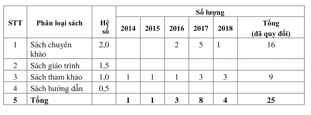 Tổng số sách (quy đổi): 25 Tỷ số sách đã được xuất bản (quy đổi) trên cán bộ cơ hữu: 25/153 = 0,16