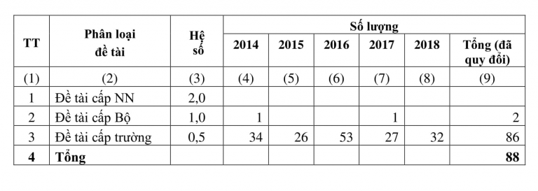 Tổng số đề tài quy đổi: 88 Tỷ số đề tài nghiên cứu khoa học và chuyển giao khoa học công nghệ (quy đổi) trên cán bộ cơ hữu: 88/153=0,58