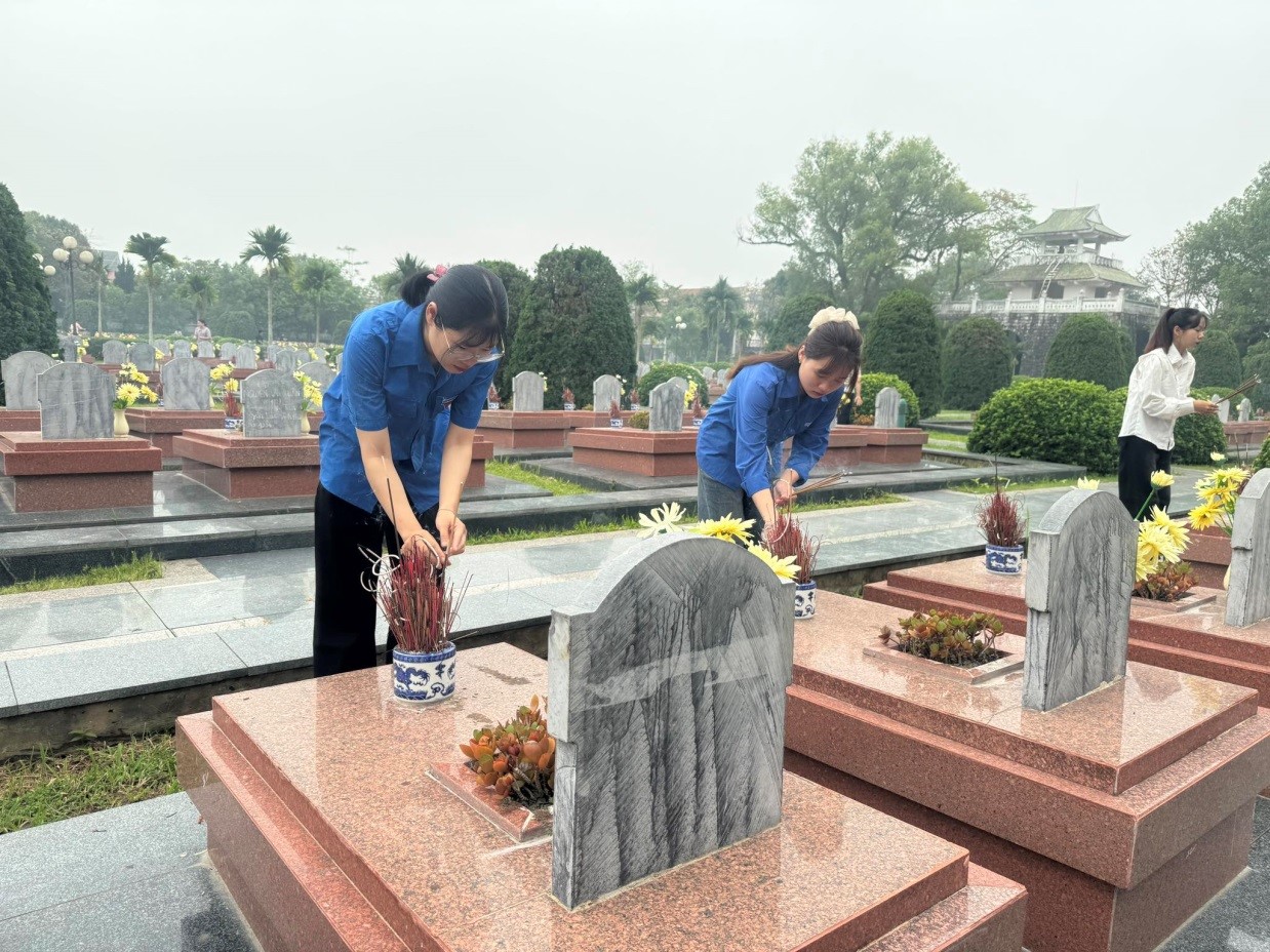 Thầy cô và các em sinh viên kính cẩn thắp hương trên phần mộ của các anh hùng liệt sỹ tại Nghĩa trang A1, Ngĩa trang Him Lam, Độc Lập và Tông Khao