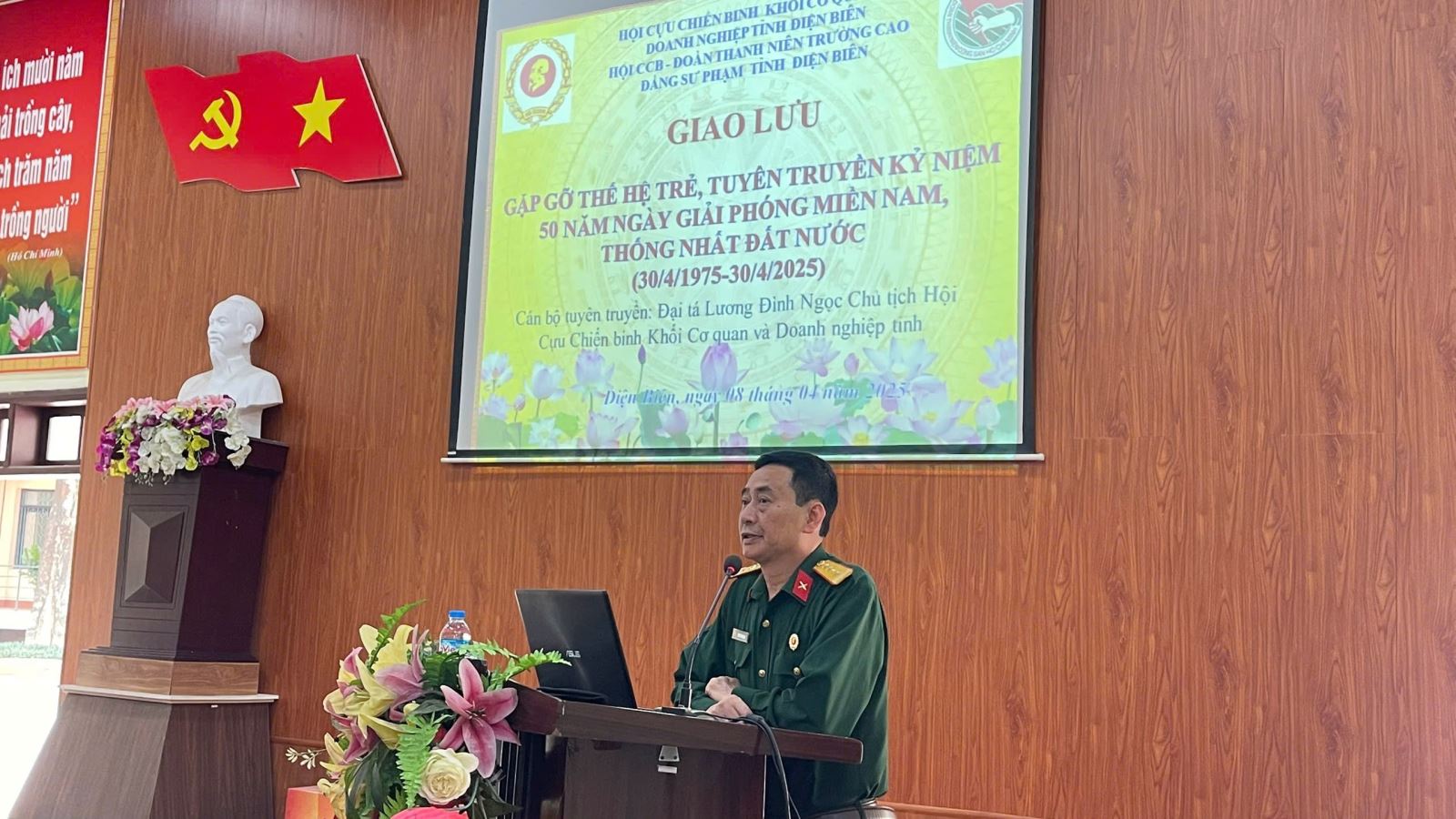 Được sự đồng ý của Ban Thường vụ Hội CCB tỉnh Điện Biên; Đảng uỷ, Ban Giám hiệu trường Cao đẳng Sư phạm tỉnh Điện Biên. Chiều ngày 08 tháng 4 năm 2025; Hội CCB Khối phối hợp với Hội CCB - BCH Đoàn Thanh niên Trường Cao đẳng Sư phạm tổ chức giao lưu tuyên truyền: Kỷ niệm 50 năm giải phóng Miền Nam, thống nhất đất nước, tuyên truyền chống diễn biến hòa bình bạo loạn lật đổ của các thế lực phản động chống phá cách mạng Việt Nam. Đến dự buổi giao lưu tuyên truyền có đồng chí Lương Đình Ngọc - Chủ tịch Hội Cựu chiến binh Khối, các đồng chí đại biểu, các đồng chí cựu chiến binh, các thầy cô giáo và toàn thể các bạn sinh viên đã tham dự chương trình.